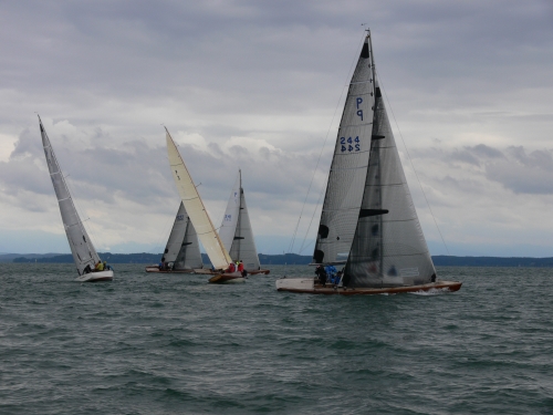Der Wind blieb schwach und das Auslaufen wurde zunächst verschoben. Ein paar Crews wagten es doch, einige Schläge zu segeln, und draußen auf dem See wehte ein stabiler 2-3er Wind. Daraufhin entschied sich die Wettfahrtleitung zum Auslaufen und um 14:19 Uhr fiel der Startschuss. Wind 1-2 aus SW. Der Kurs: quer über den See.
