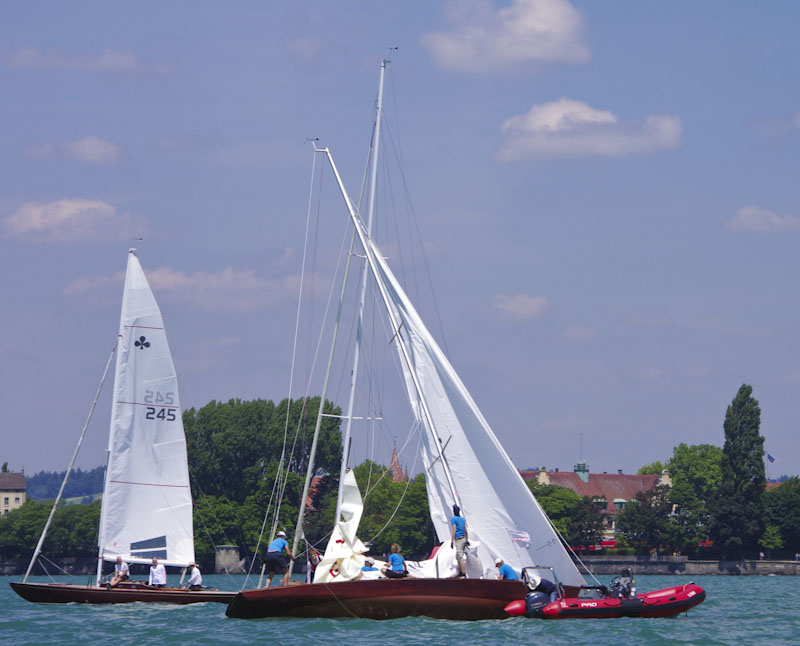 Zur dritten Wettfahrt frischte der Wind dann noch mal etwas auf, so dass bei ca. 10 bis 12 Knoten weiterhin aus West die meisten Teams auf G2 wechselten. Leider hat Ariadne dabei das Startprozedere aus den Augen verloren und als sie, etwas spät dran, von der Bahnseite aus versuchte, hinter die Startlinie zu tauchen, kam es zur Kollision der Masten mit der Schuft. Die Wettfahrtleitung entschied geistesgegenwärtig und absolut richtig, den Lauf sofort abzubrechen, da sich beide Masten ineinander verhakten und dadurch insbesondere die Schuft in extreme Schräglage gedrückt wurde. Wir alle hatten dabei große Sorge, dass sie zu viel Wasser schöpft. Mit vereinten Kräften der beiden Crews, der herbeigeeilten Schlaucher sowie zwei Seglern der May, die schwimmend zu Hilfe gekommen waren, konnten die Masten dann aber „entwirrt“ werden und beide Schiffe konnten aus eigener Kraft den Hafen erreichen. Personen sind Gott sei Dank nicht zu Schaden gekommen, aber die Masten von Schuft und Ariadne haben sicherlich einiges abbekommen. Dies kann einem noch mehr leid tun, wenn man weiß, dass beide Yachten zu Beginn der Saison ein neues Rigg bekommen hatten.